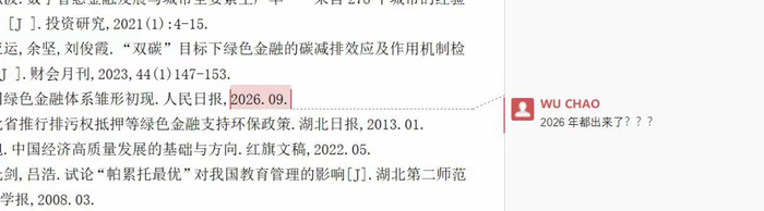 学生 2025 年年底提交的一篇论文中:绿色金融体系雏形初现. 人民日报, 2026.09.